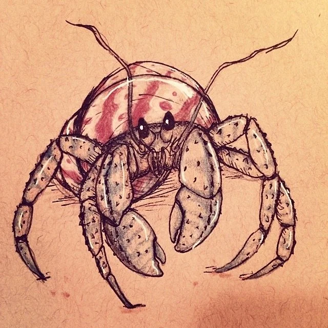 "Hermit Crab" 4 x 4 recycled brown paper Color pencil, Pen